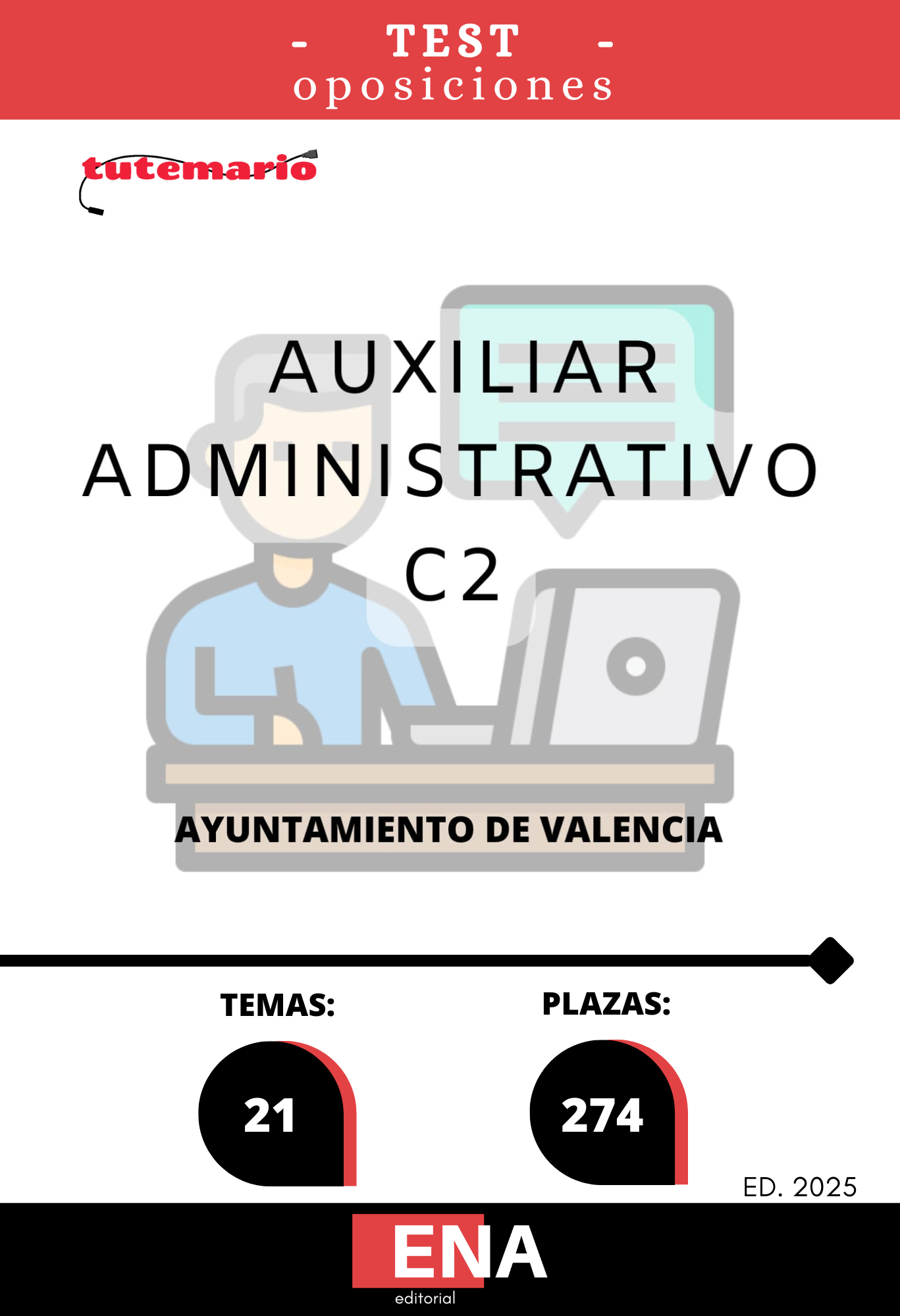 LIBRO DE TEST, donde desarrollamos preguntas tipo test de 4 respuestas alternativas, basadas en los 21 temas solicitados para la fase de oposición, de las 274 plazas de Auxiliar Administrativo C2 convocadas por el Ayuntamiento de Valencia por publicación el 12 DE JULIO DE 2024, en el Boletín Oficial de la Provincia de Valencia, POR TURNO LIBRE.