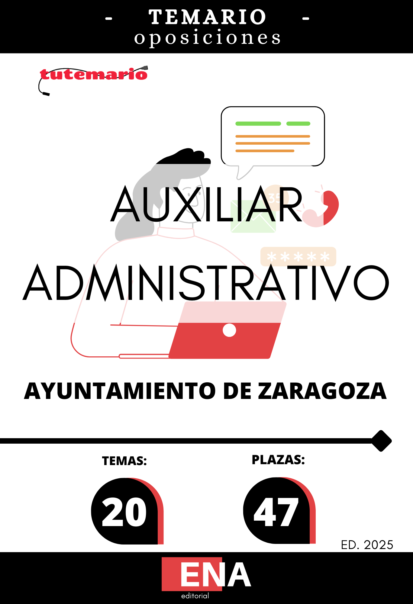LIBRO TEMARIO, sobre los 20 temas solicitados para el estudio de la fase de oposición de las 47 plazas de Auxiliar Administrativo C2. En cumplimiento de lo dispuesto en el Acuerdo del Gobierno de Zaragoza de 15 de diciembre de 2022, de aprobación de la oferta de empleo público del Ayuntamiento de Zaragoza del año 2022; Acuerdo del Gobierno de Zaragoza de 11. mayo de 2023, de aprobación de la oferta de empleo público del Ayuntamiento de Zaragoza del año 2023; Acuerdo del Gobierno de Zaragoza de 13 de junio de 2024, de aprobación de la oferta de empleo público del Ayuntamiento de Zaragoza del año 2024, y Acuerdo del Gobierno de Zaragoza de 23 de mayo de 2025, de aprobación de la oferta de empleo público del Ayuntamiento de Zaragoza del año 2025, y con el fin de atender las necesidades de personal de esta Administración Pública, así como en uso de las atribuciones conferidas mediante decreto de la Alcaldía de 21 de junio de 2023; Acuerdo del Gobierno de Zaragoza de 17 de febrero de 2009, de delegación de atribuciones, y decreto de la Alcaldía de 19 de enero de 2009, de delegación de atribuciones, resuelvo convocar procesos selectivos para la provisión de plazas integradas en el grupo/subgrupo de clasificación profesional C2 de la plantilla de personal funcionario, mediante ingreso por el turno libre ordinario y los turnos libres de reserva, y el sistema selectivo de oposición.