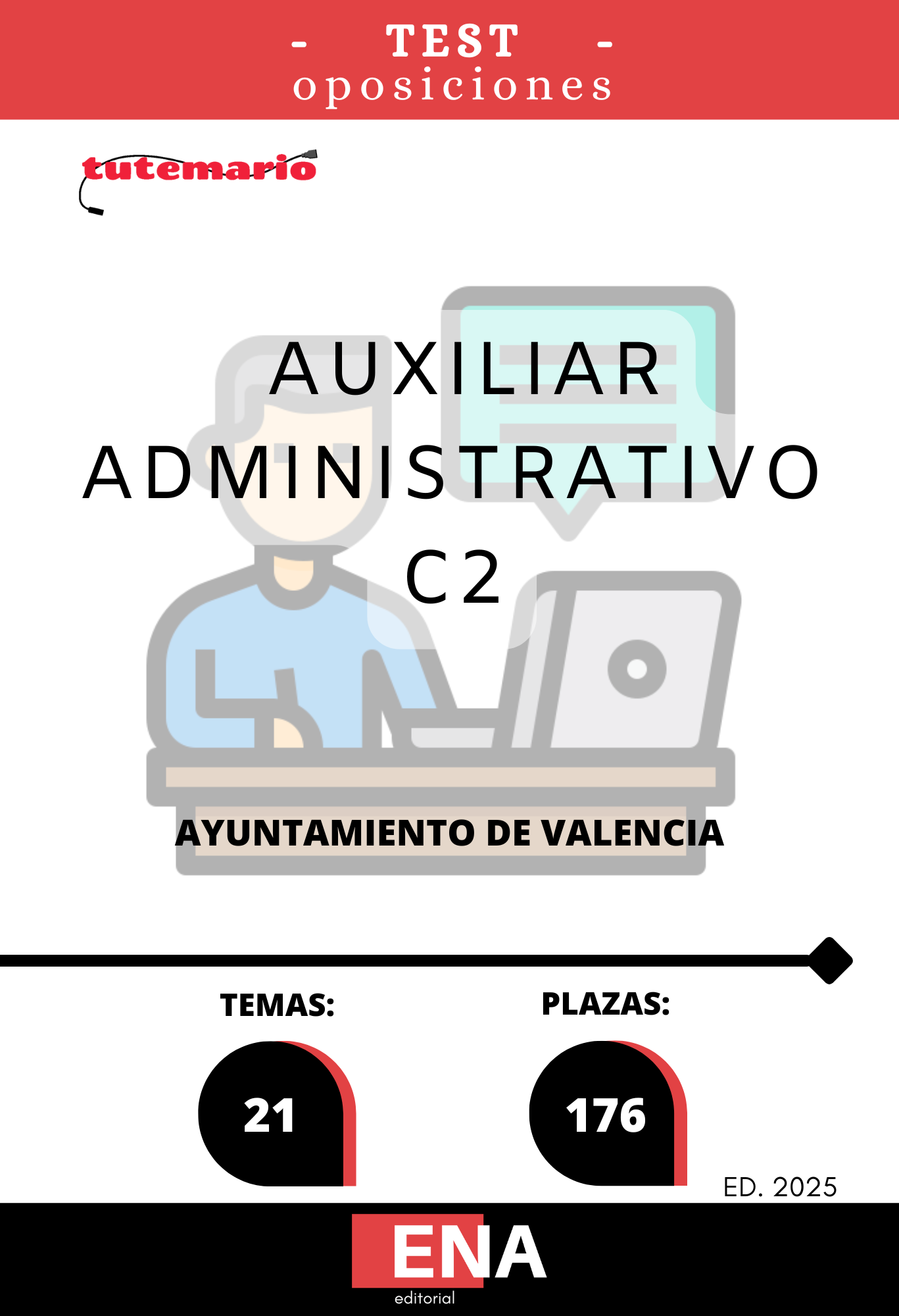 PACK DE ESTUDIO COMPLETO, formado por: LIBRO TEMARIO + LIBRO DE TEST, donde desarrollamos, los 21 temas solicitados para la fase de oposición, de las 176 plazas de Auxiliar Administrativo C2 convocadas por el Ayuntamiento de Valencia por publicación el 12 DE JULIO DE 2024, en el Boletín Oficial de la Provincia de Valencia, POR TURNO LIBRE.