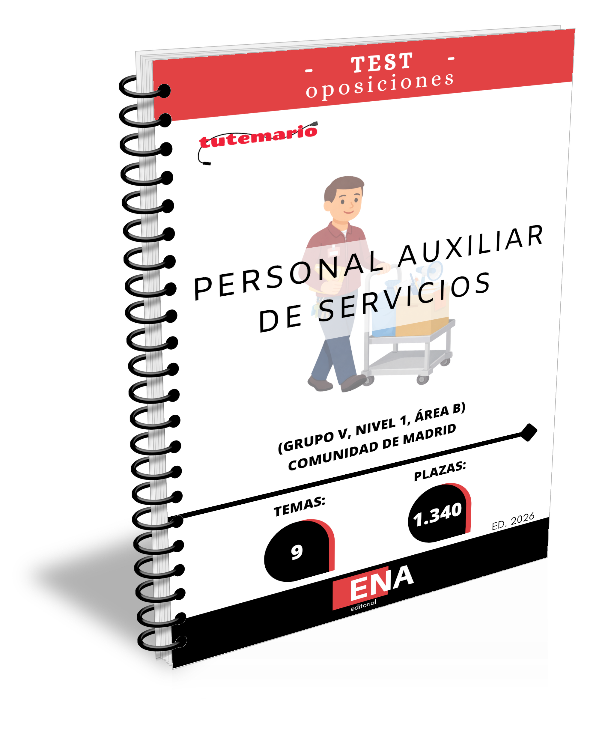Vamos a desarrollar en este LIBRO DE TEST, con preguntas (DE CUATRO OPCIONES DE RESPUESTA), sobre los 9 temas solicitados en las oposiciones a 1.340 PLAZAS DE Personal Auxiliar de Servicios de la Comunidad de Madrid, GRUPO V, NIVEL 1, ÁREA B, publicadas en el BOCM.