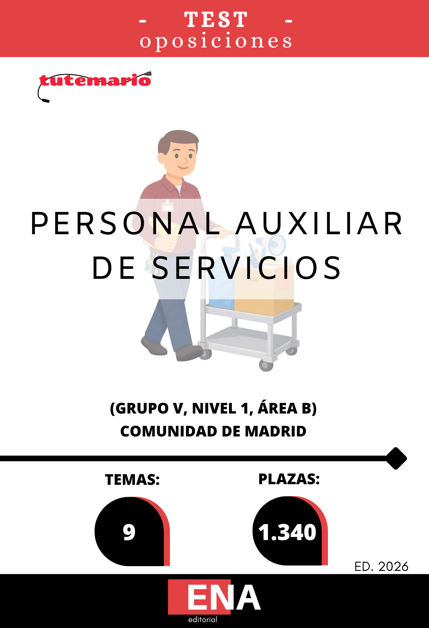 Vamos a desarrollar en este LIBRO DE TEST, con preguntas (DE CUATRO OPCIONES DE RESPUESTA), sobre los 9 temas solicitados en las oposiciones a 1.340 PLAZAS DE Personal Auxiliar de Servicios de la Comunidad de Madrid, GRUPO V, NIVEL 1, ÁREA B, publicadas en el BOCM.