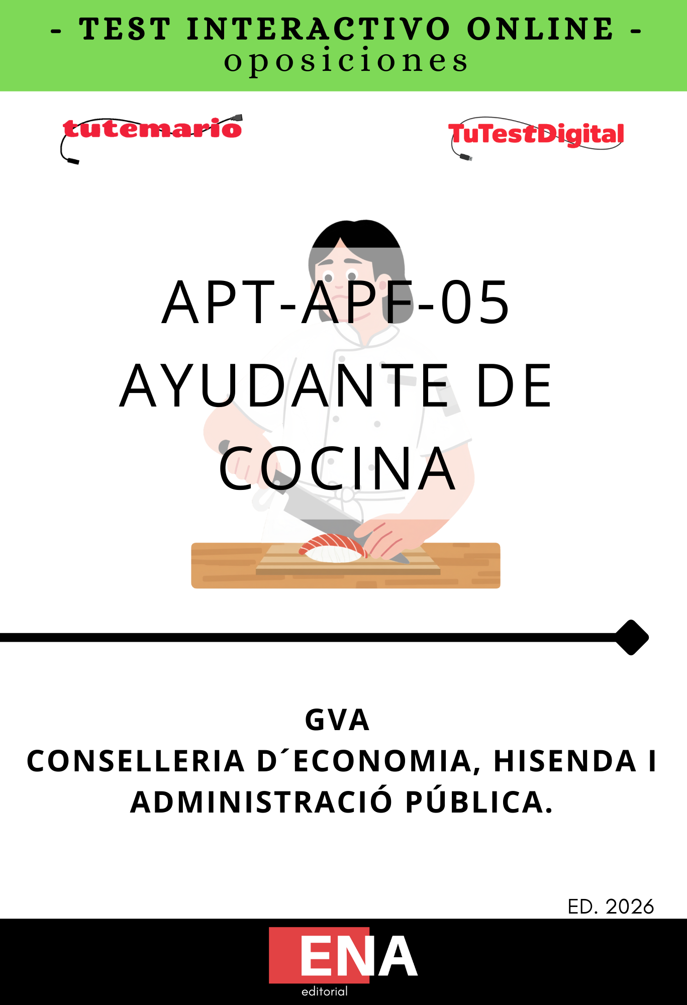 Vamos a desarrollar en este TEST INTERACTIVO, con preguntas (DE CUATRO OPCIONES DE RESPUESTA), sobre los temas solicitados para pruebas selectivas de acceso a las agrupaciones de puestos de trabajo (APT) de la agrupación profesional funcionarial (APF), turno libre, por el sistema de oposición, para cubrir las plazas previstas para la convocatoria 84/26 de AYUDANDE DE COCINA APT-APF-05, correspondientes a la oferta pública de empleo de 2026 para personal de la Administración de la Generalitat.