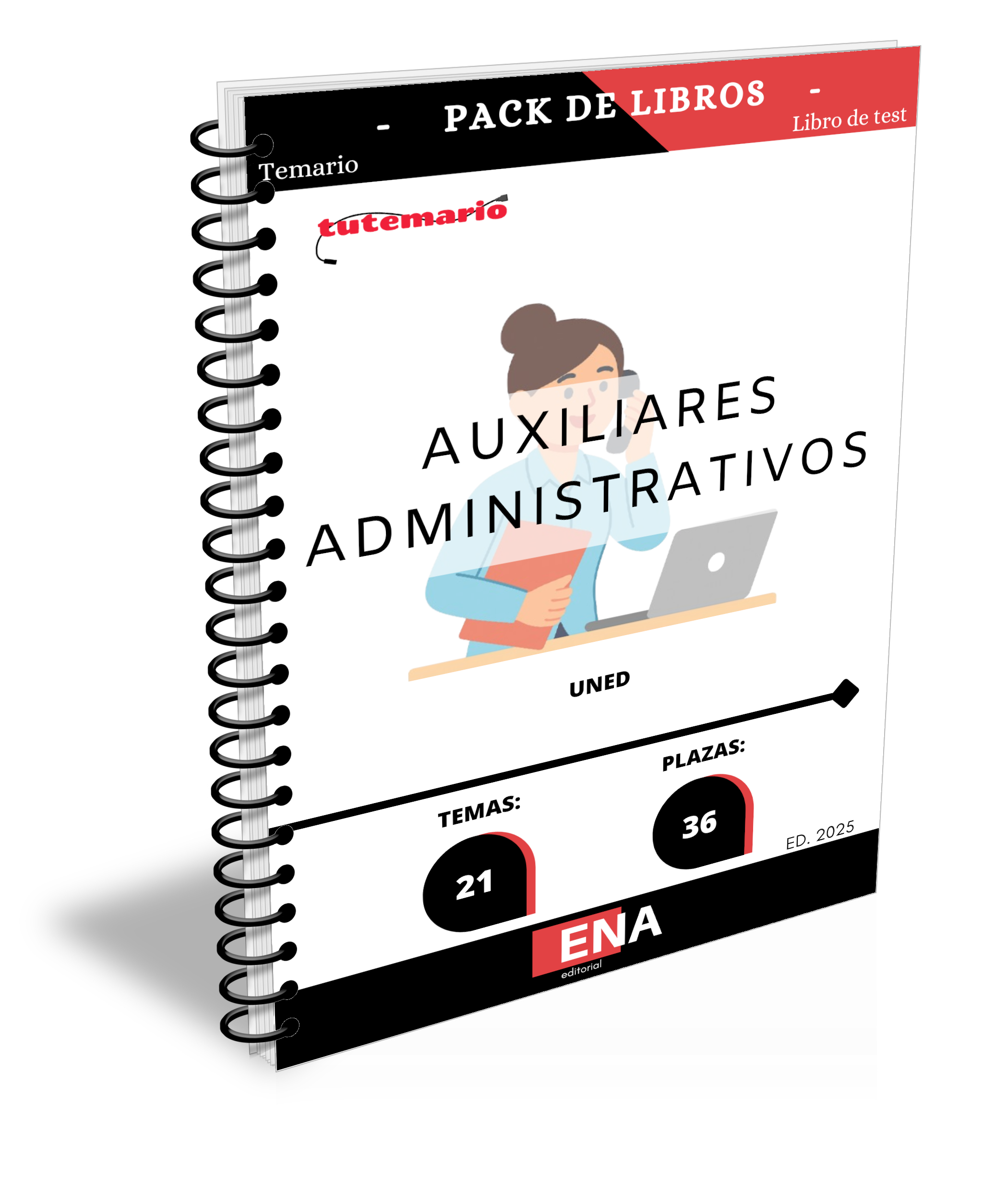 Vamos a desarrollar en este pack de estudio completo de TEMARIO y TEST, con preguntas (DE CUATRO OPCIONES DE RESPUESTA), sobre los 21 temas solicitados para el estudio de las oposiciones de 36 plazas de Auxiliares Administrativos, por Resolución de 18 de diciembre de 2024 (BOE de 25 de diciembre), de la Universidad Nacional de Educación a Distancia (en adelante, UNED), donde se publica la oferta de empleo público correspondiente al ejercicio 2024 para personal técnico, de gestión y de administración y servicios, en la que se incluye la autorización de la convocatoria de plazas de nuevo ingreso en la Escala de Auxiliares Administrativos de la UNED, Subgrupo C2, por el sistema general de acceso libre.